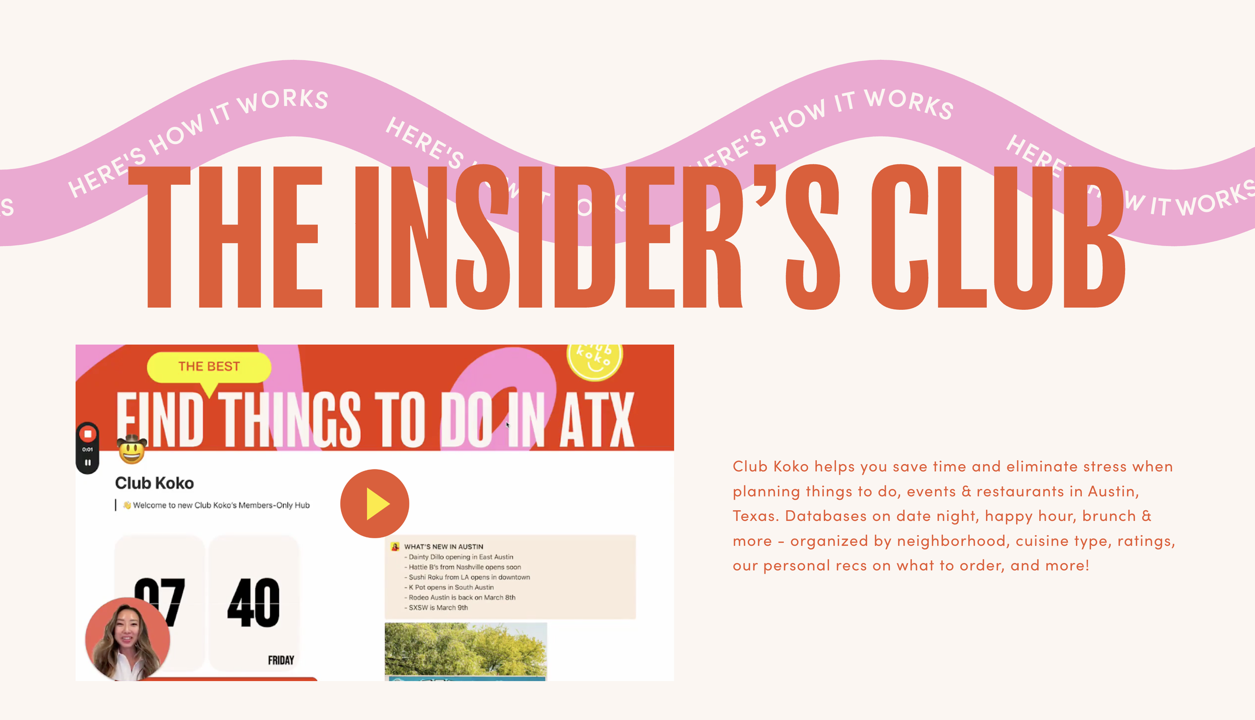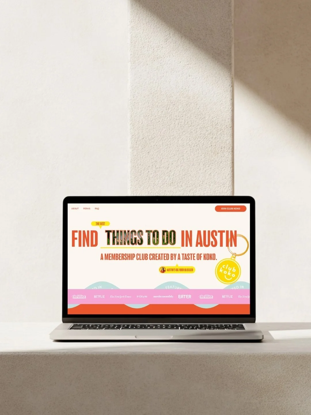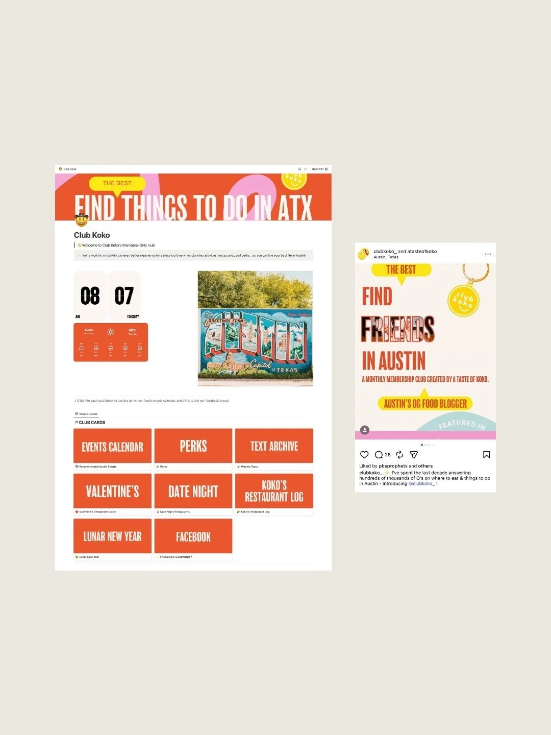 Club Koko is a membership club by A Taste of Koko, designed to find friends, events, restaurants, and things to do in Austin, Texas.